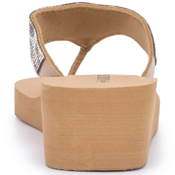 These Olivia Miller Wedge Sandals feature a fashionable upper, between-the-toe thong design, and an elevated heel.